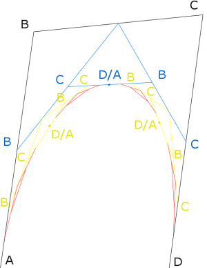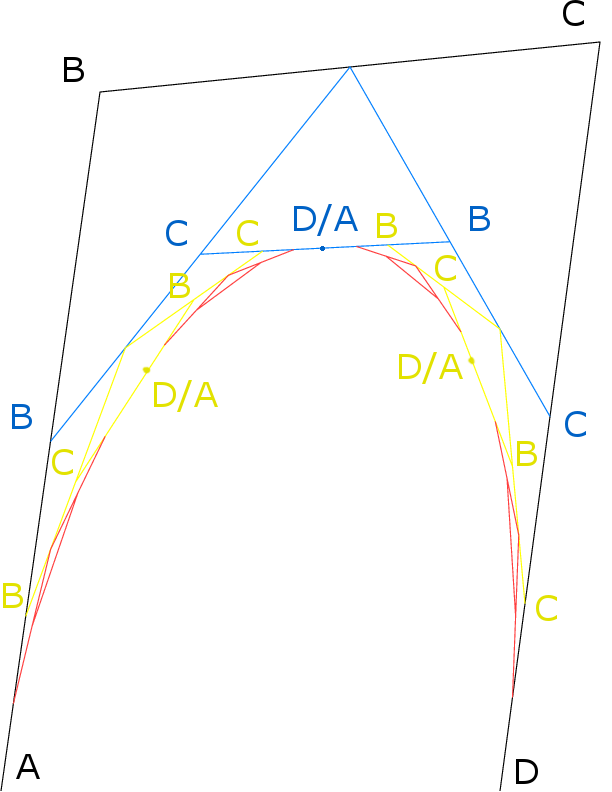 This results of the algorithm (for three iterations) are shown in Image 1, where the black A represents the start of a spline curve, the black D represent the end, and the black B, & C represent the control points. The Sky blue lines are the result of the 1st iteration of this algorithm (along with renumbering), yellow the second, and red is the third.